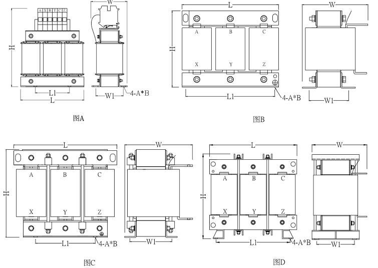 電抗器規格型號 | 適配六脈沖整流功率(KW) | 額定電流(A) | 電感量(mH) | 重量(Kg) | 外形尺寸(L*W*H) | 安裝尺寸(L1*W1) | 安裝孔徑(A*B) | 圖號 |