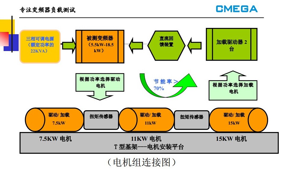 ?? 目前很多國內(nèi)的變頻器生產(chǎn)廠家的整機(jī)負(fù)載測試系統(tǒng)大都采用比較傳統(tǒng)的方式-—?jiǎng)?lì)磁電機(jī)調(diào)試,不僅特別耗電,而且勵(lì)磁部分容易發(fā)熱損壞。隨著市場上大功率變頻器的應(yīng)用越來越廣泛,要求也越來越高,不僅產(chǎn)品功能要豐富,而且質(zhì)量要可靠。由于大功率的變頻器對溫度很敏感,特別是逆變模塊的溫度控制是整臺變頻器穩(wěn)定性測試中最重要的指標(biāo)之一,目前檢測溫度的唯一手段就是帶相對應(yīng)功率的額定電流,已達(dá)到測試要求。但隨著生產(chǎn)功率增大的同時(shí),電源變壓器也要相應(yīng)的增大,這給企業(yè)帶來了一筆不菲的投入,而且每年都要付出一筆不小的增容費(fèi),少則幾萬,多則幾十萬,一年到頭利用率也不是很高;那么怎樣才能在不增加電源容量的同時(shí)又能解決大功率變頻器的調(diào)試問題呢???很多企業(yè)都希望找到一種更加合理經(jīng)濟(jì)的變頻器負(fù)載測試系統(tǒng) !